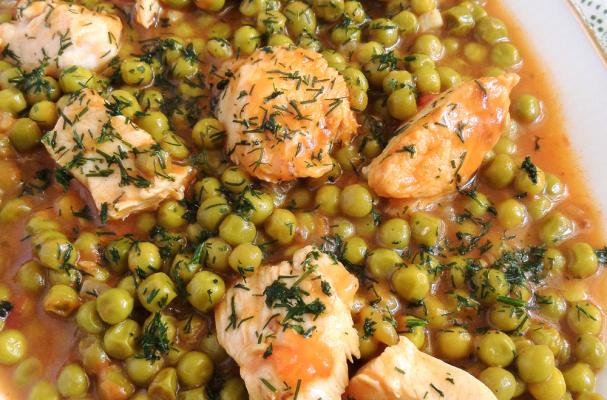 Sweet peas and tender chicken pieces in a delicious tomato gravy and topped with lots of dill, Romanian pea and chicken stew just like my grandmother used to make