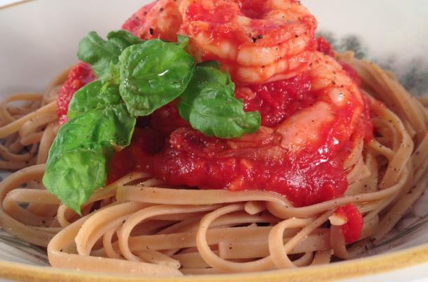 Pasta, my go to weeknight dinner when I have been running around all day or just have nothing planned. Pasta is one of those things that i’ve always always got stocked well in my pantry. Also almost always on hand is canned crushed tomatoes and a bag of frozen shrimp. This sauce is pretty simple and how I make my basic marinara. The sauce simmers away for a few hours if you have time, less if you are in a rush, then the shrimp are tossed right in there at the very last minute. They are cooked in just 6-8 minutes and dinner is ready to go. You can easily turn this is into a Shrimp Arrabiata (spicy tomato sauce) by adding in crushed red pepper flakes. Serve up a simple salad of baby arugula, tomatoes, dressed with olive oil, lemon juice, salt and pepper… its delicious!!