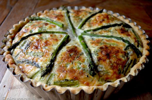 Bake quiche for 35 minutes until the top is just about set. Arrange 6-8 asparagus spears on top of quiche and continue to bake for another 25-30 minutes, until the custard is set (if edges begin to brown too quickly, cover with foil). Cool to room temperature, cover and chill for 24 hours.