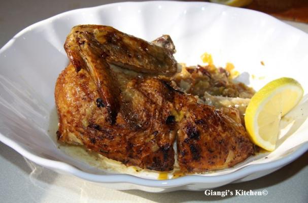 While I had the oven on, I crushed a couple of garlic cloves, seasoned well the broccolis with olive oil, salt and pepper and place them in a cookie sheet. In the oven they went for 15 minutes while the chicken was finishing cooking.