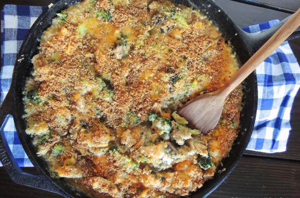If you're using an oven proof skillet, sprinkle remaining 1/2 cup cheese and bread crumbs on top of the mixture and place in the oven. Otherwise pour the mixture in your baking dish then top with the cheese and bread crumbs. Bake until cheese is melted about 5 minutes. Then turn the broiler on high and broil for just a few minutes to get the cheese a little crispier.