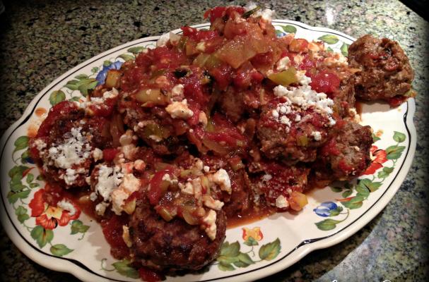 Combine all of the above ingredients, except the Feta cheese, in a bowl and mix with your hands. Do not over mix. Form into desired size meatballs.