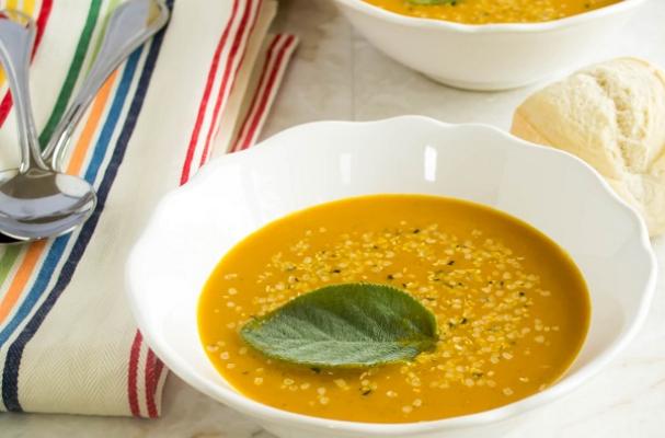 Spicy carrot amaranth soup - Healthy and vegan meal for cold weather herbed with fresh sage leaves.