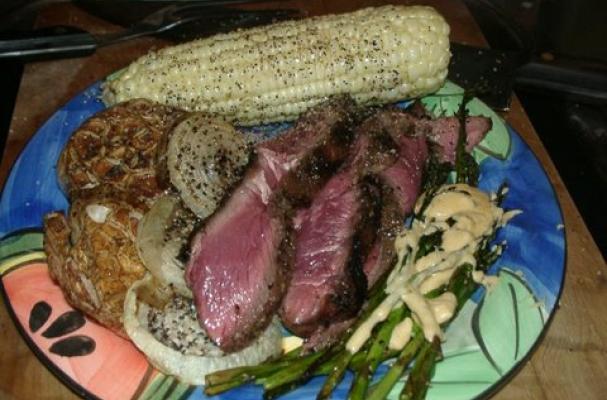 Steak: Sprinkle a little Worcestershire sauce over the meat then shake your spices over it. Using your fingers, try to rub the seasoning into the meat as best you can. Keep in mind that you are trying to make a crust that will sear on/in to the steak. Think about your taste and season accordingly. I like lots of garlic, pepper, chipotle and a little salt. Set the steak aside while you enjoy a beer. Steaks are best cooked at room temperature so that they cook evenly. Use High Direct Heat 450- 500 degrees 7 to 9 minutes per side. This will vary with their size and how well done you want it. One this size it will be rare to medium rare.