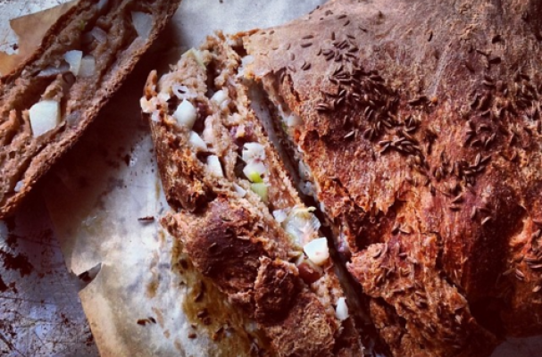 Stretch the dough and top with the stuffing ingredients (herbs, potatoes and chives) and roll up dough, then fold it back together, leaving the crease resting on the paper.