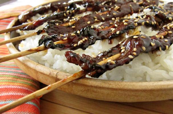 Plunging a stick in food was a genius idea – I sincerely wish we could thank the person who originally thought of doing that. Think about hard candy. If someone was like ohh, here have some candy and they handed you hard candy you would be like um thanks? But get a stick in that hard candy and it becomes fun! You would totally be happy if someone gave you a lollipop. Take a corn dog... If possible, Seth would probably divorce me and marry the person who came up with that. Take the stick out of the cornbread encrusted hotdog, and he would be like ehhh, ok. But once that stick is there it is all like, ohh my god must have it. Here, we take fresh beef flap meat, marinate it in a homemade teriyaki sauce, skewer it, then grill it over high heat, brushing it with a thickened version of the marinade. Like eating a popsicle, but all meaty and umami. And you know, grilled. And not frozen. Actually the opposite.