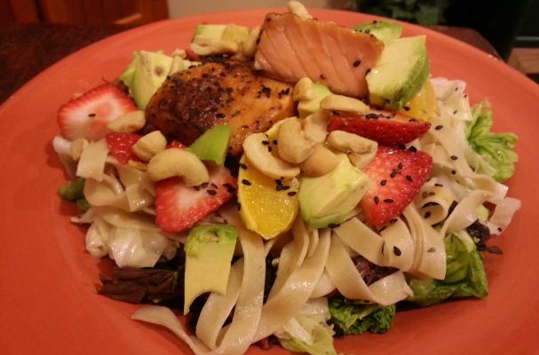 Bake salmon fillets at 350 until done. In a large salad bowl, place chopped lettuce, chilled noodles, fruits and veggies and top with Salmon filet and chopped nuts if desired. Serve with light peanut sauce.