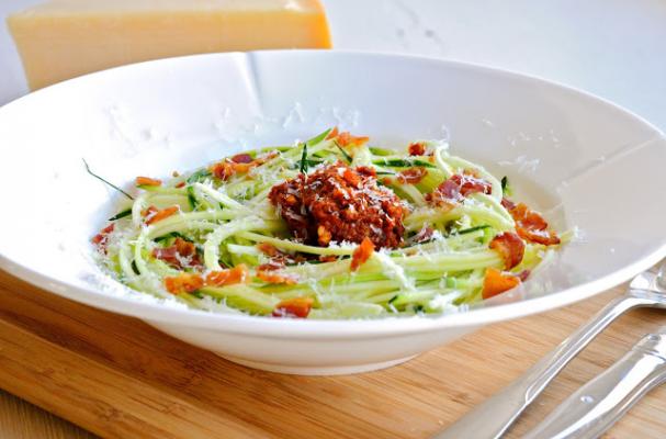 Zucchini Spaghetti with Tomato-Almond Pesto, Pancetta & Parmesan