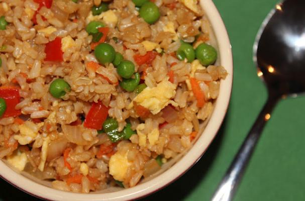 Currently, there a lot of recipes for healthier versions of Chinese classics surfacing, and I have totally embraced this movement. My favorite so far is this lightened-up fried rice. The takeout version is super oily, but the great thing about making it on your own is that you can control the oil quantity and add whatever veggies or protein you fancy, to give it a more nutritional kick. This version features brown rice, a variety of vegetables, and there's a little protein from the egg. It's a great side dish for any Asian-inspired protein, and it's also really satisfying on its own! Try it out; you can't go wrong!