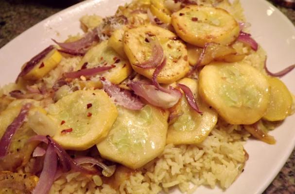 Plate the rice and top with the sautéed squash, drizzle olive oil, dash of red pepper flakes and grated Romano cheese.