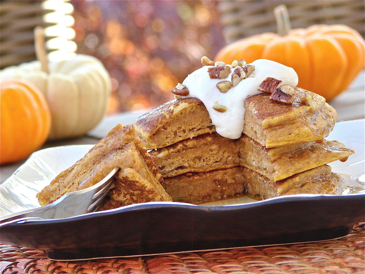 If you love the flavor of pumpkin pie, try these warmly spiced pancakes topped with vanilla yogurt (or whipped cream!) and a drizzle of pure maple syrup. Delish! I took this photo outside on a gorgeous autumn day.