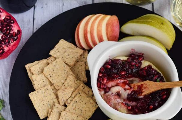 Hosting a holiday party? If so, you have to make this Pomegranate Cranberry Baked Brie. It is perfect served warm from the oven at your next soiree. It is delicious on crackers, sliced pears or crostini.