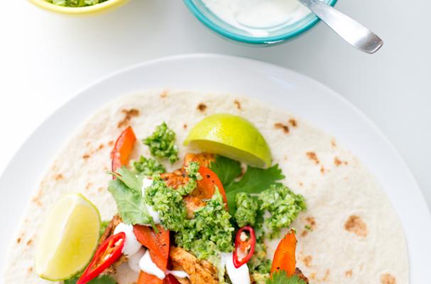 I am always looking for those fresh flavours that signal summer. Summer to me is all about maximum flavour with minimum effort, you want to maximize your outdoor time, instead of slaving away in a hot kitchen, so there is no better way to do this then to look to Mexico for inspiration! This next recipe is a simple offering that is packed with loads of flavour and provides a little heat. Coriander, spring onions, chillies, limes, garlic, paprika bring a little Mexicana Fiesta to your table! This is a great party dish as its all about sharing, so helps keep things informal and relaxed, bringing diners together. The chicken and the Salsa Verde are the main contenders in this recipe, wrapped inside a warm tortilla with sour cream and guacamole providing the cooling effect. This is dining that is simple, fast and fresh. ” ¡Comer con gusto!”