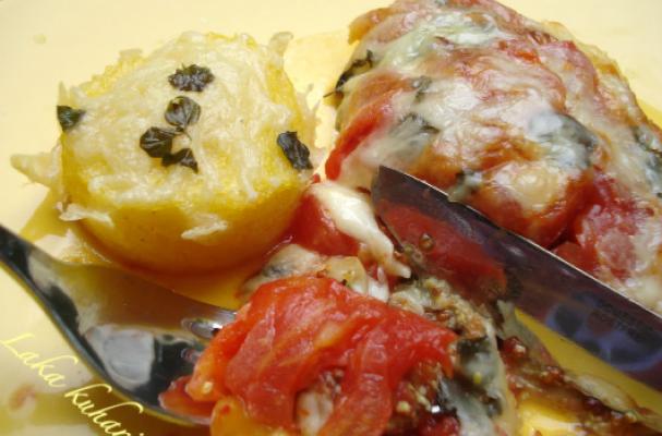 Cover steaks with sliced tomatoes, sprinkle with fresh oregano leaves. Top with grated cheese and cover the dish.