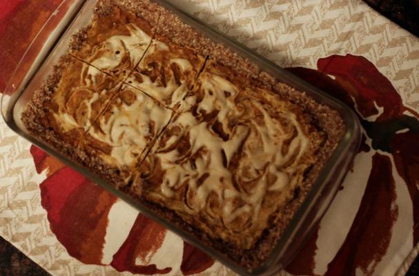 To assemble the tart: Retrieve the crust from the freezer and pour the squash mixture over the crust. Smooth with a spatula. Drop spoonfuls of the cashew cream onto the surface of the tart (you will only use up to 1/3 cup or even less). Use a toothpick and swirl the creme so that you achieve a marbling effect with the squash mixture.