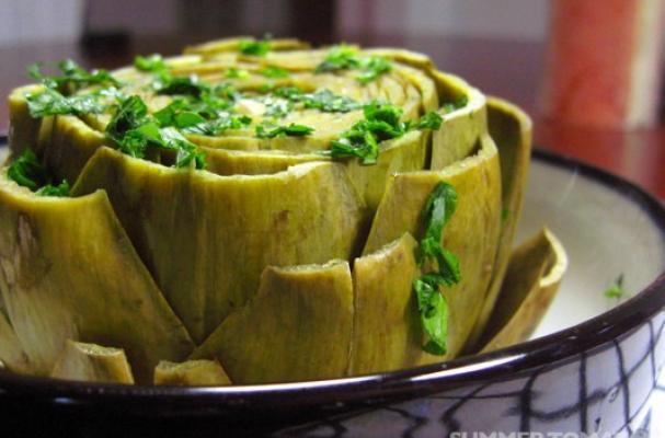 Snip the thorns off the artichoke leaves. Place the garlic slices inside the leaves throughout the artichoke. Put the artichoke into a medium-size saucepan. Add water to come halfway up the artichoke.
