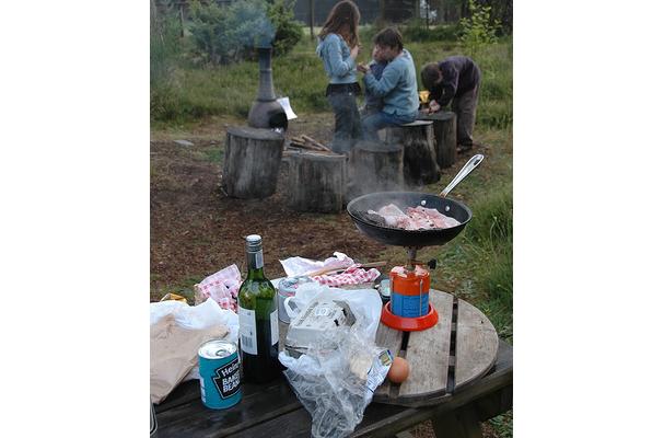 Place piece of bacon in bottom of small paper lunch sack. Extend over coals of camp fire or charcoal fire using stick or roasting fork. Be careful not to let bottom of sack touch the coals. As bacon cooks the bottom of the sack will be coated with bacon grease. When bacon is almost cooked, break egg into sack. Continue holding sack over coals. When egg is cooked, peel back top of sack and eat out of the bag.