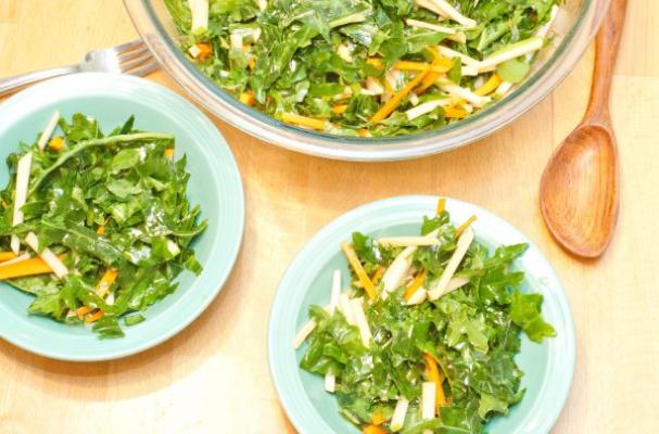 Add the carrot, apple, and rutabaga to the kale. Add the dressing and toss. Season with salt and pepper and serve.