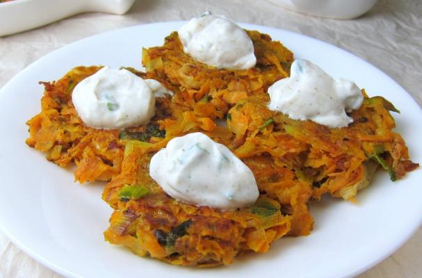 Sweet Potato Latkes with Cumin-Garlic Yogurt Topping