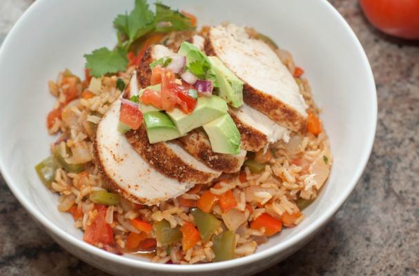 Add rice and peppers to a bowl** and top with sliced or diced chicken and top with more pico and fresh avocado.