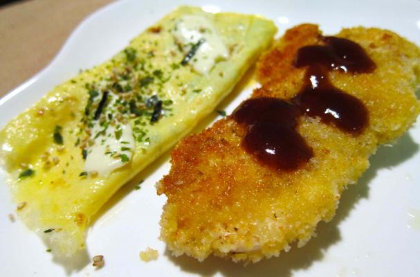Heat a pan skillet with a good amount of vegetable oil on medium heat. Dip one egg-saturated chicken fillet into the panko on both sides, and then place onto the skillet to pan fry. Repeat with the other fillets. Flip until one side is golden brown. Pan fry each side for about 4-5 minutes, or until inside is completely cooked. The chicken katsu is done at this point. Keep the egg batter from the chicken katsu for the side dish.