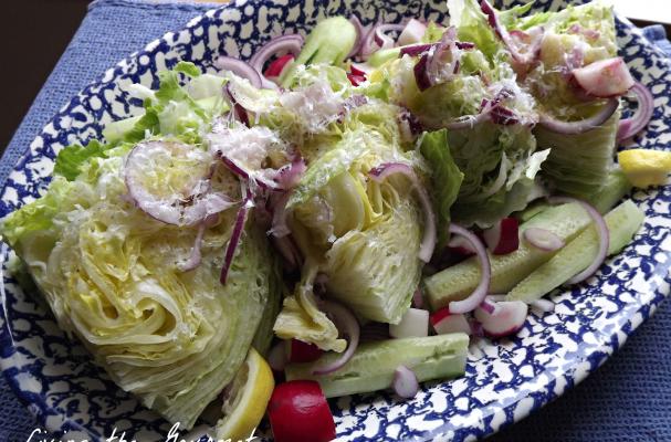 Quarter the lettuce and arrange on a platter. Add the cucumber, radishes, onions and grated cheese. Finish with the dressing.
