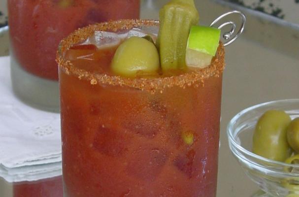 Serve drink directly over ice and garnish with pickled okra, jalapeno-stuffed olive and lime wedge. ENJOY!