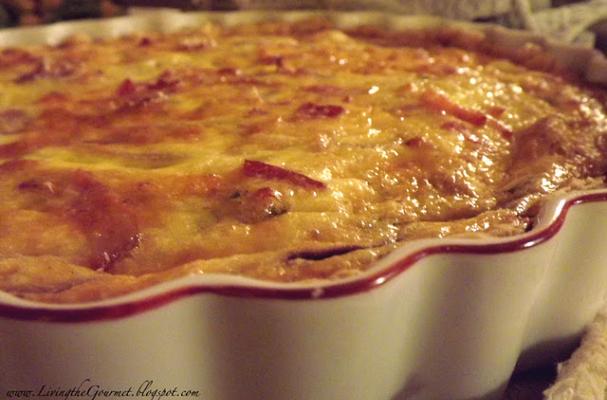 In a large bowl mix together the eggs, milk, cheeses, chopped jalapeño, onion, grated garlic and bacon. Pour into the cooled pie shell. Grate a little more Romano cheese on top.