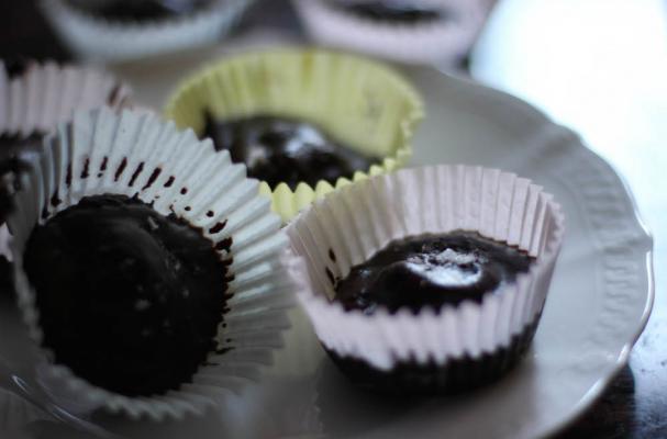 Spoon a little less than a tablespoon of chocolate into a regular sized muffin tin. Use a utensil to smother the chocolate so it covers the bottom entirely. Repeat until all tins have chocolate at the bottom. Spoon a small teaspoon of caramel sauce on top of each chocolate puddle. Then scoop out a heaping teaspoon of almond butter filling and roll into a ball. Press down on top of each chocolate/caramel puddle in the muffin tins. Repeat with all tins. Spoon a little less than one tablespoon of chocolate mixture onto the top of each almond butter ball to cover it completely. You can use your finger to maneuver the chocolate -if it is messy, no worries (isn’t that the fun of it?)! Sprinkle a pinch of flaked sea salt on each almond butter cup and chill in the fridge until they are set.