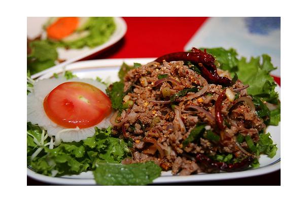 Roast meat. Combine soy, juice, vinegar, chili, garlic, oils and ginger. Thinly slice meat into bite size pieces. Dress with 1/2 salad dressing. Dress greens with remaining dressing. Arrange greens on plates and divide meat among plates. Garnish with black sesame seeds and cilantro. Available in oriental markets.