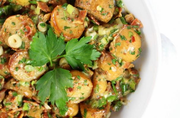 Smoky Salt and Vinegar Potato Salad – full of tangy smoky flavored baby yukon potatoes, crispy bacon, fresh green onions, parsley and smoked salt.