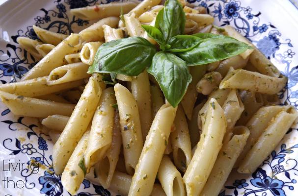 Add pesto and beans to the macaroni and toss. Take a little extra fresh basil, give it a fine chop and toss it in with the macaroni.