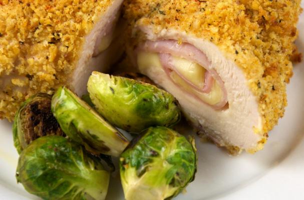 Lay 2 slices of cheese on each breast, followed by 2 slices of ham, and 2 more of cheese; leaving a 1/2-inch margin on all sides to help seal the roll. Tuck in the sides of the breast and roll up tight like a jellyroll. Squeeze the log gently to seal.