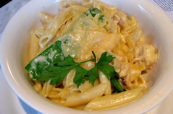 Drain pasta, transfer to a large serving bowl, and top with chicken. Pour sauce over pasta, toss in a handful of snow peas and red pepper flakes, and toss well.