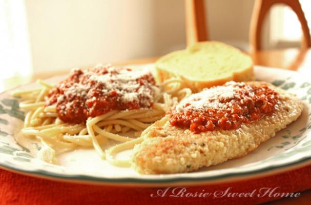 Pour pasta sauce over chicken, then top with cheese. Bake 10 more minutes or until chicken reaches 170 degrees and is no longer pink.