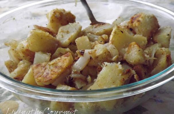 Place the potatoes on a hot griddle. Sprinkle with seasonings to taste and drizzle with olive oil. When the potatoes have a golden crust on one side, turn over repeat process on the other side.