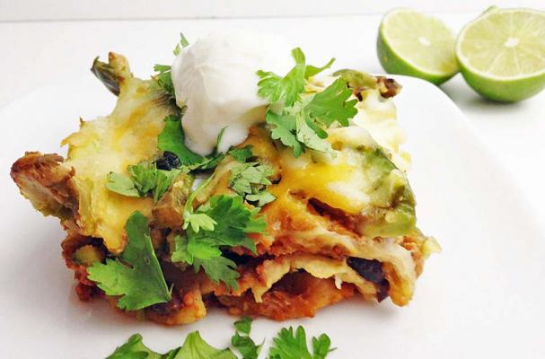 3.Layer 1:In a 9 by 13 baking dish, spread salsa on the bottom evenly. place 3.5 tortillas on top, making sure they cover evenly. Add 1 cup of turkey mixture on top of tortillas, spreading evenly. Add 1 cup of cheese on top, sprinkling evenly. Place ⅓ cup of thinly sliced red onion on top of cheese.