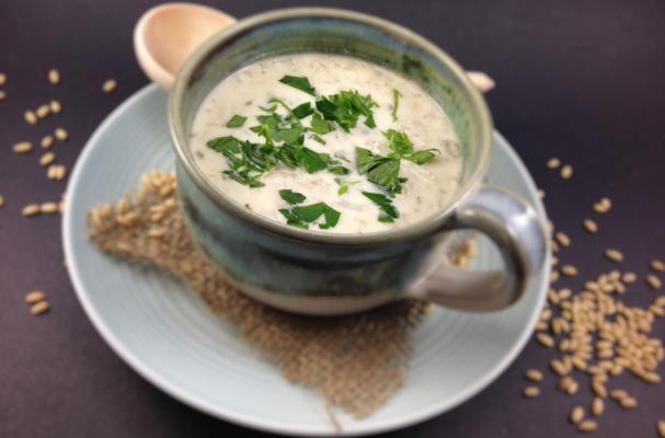 This soup gets its creamy texture from yogurt, its coolness from mint, and its health factor from barley.