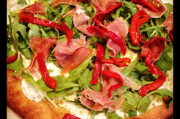 Allow it to cool for about 10 minutes. Top with arugula, torn pieces of proscuitto and the roasted peppers. Again, drizzle with more olive oil and a little extra pepper.
