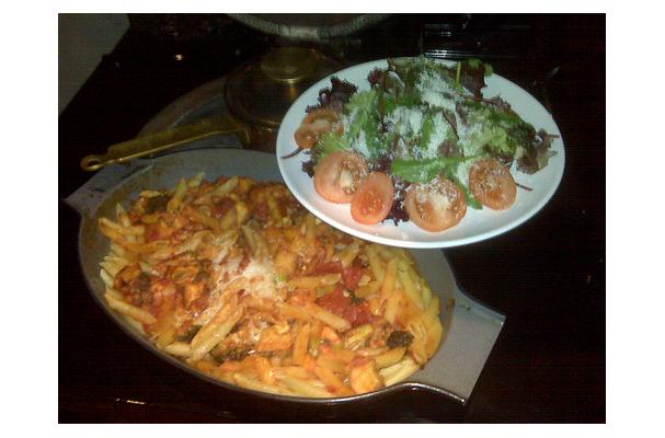 1 In a large pot of boilingsalted water cook rigatoni or fusilli pasta with one tablespoon of oil until al dente. Drain.