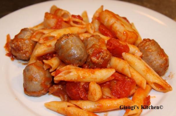 For dinner a one meal dish was of order. Penne with sausage, tomatoes and potatoes. Simple and easy and nothing to it.