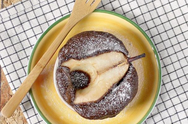 Slowly lower a pealed half pear into each ramekins.