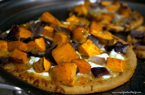 Whole Wheat No-Yeast Pizza with Roasted Garlic, Sweet Potatoes, and Onions