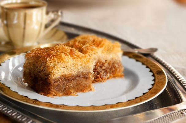 Cover the pan with foil and place in preheated oven. Bake at 175 degrees for half an hour, then remove the foil and bake for another half hour. Kantaifi should be well browned, otherwise it becomes like mud when you put up the syrup.