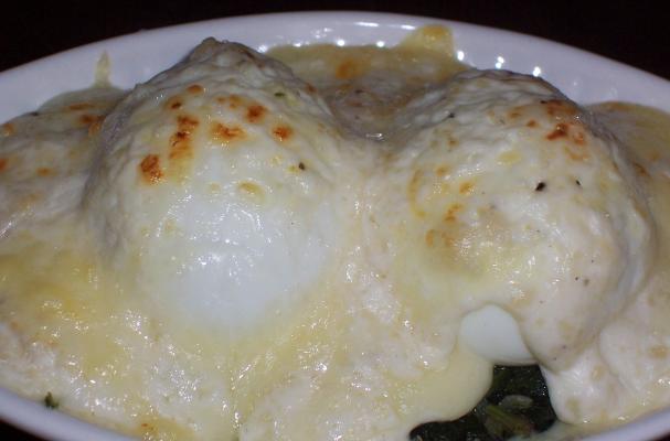 With the bed of spinach and the eggs nestled in, carefully spoon the Mornay sauce over the eggs and spinach and top the eggs with the remaining cheese.