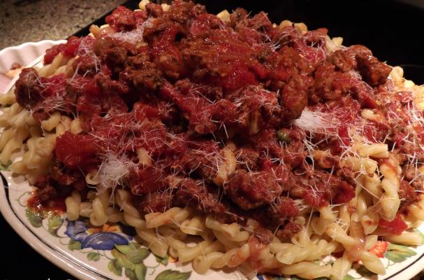 Sauté until the onion is softened. Add the tomatoes, wine and the seasonings and gently simmer on low, slightly covered for 25-30 minutes.