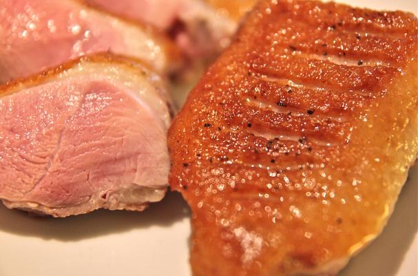 Pink-blush duck breast with crispy, crackling top, done home sous-vide style