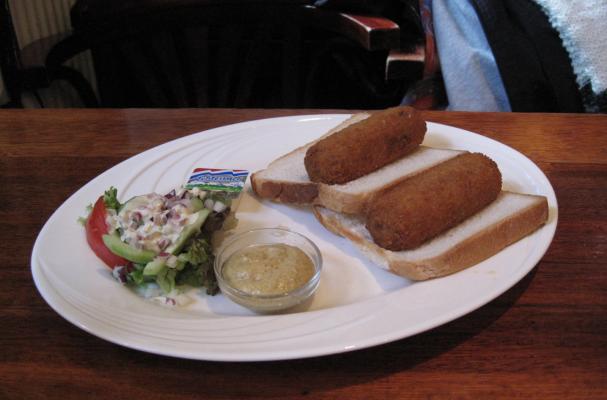 Roll pieces thru breadcrumbs then thru lightly beaten egg, and again thru the bread crumbs. Place in the refrigerator for about 1 hour.