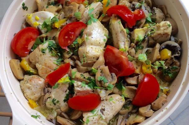 In a large nonstick skillet heat the olive oil , add the chicken, onion and cook for 6 min.