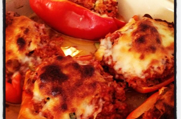 Spoon the filling into the bell peppers. Top easy with mozzarella cheese. Bake in a 375 degree oven for 24-30 minutes. The peppers should be softened and the mozzarella browned.